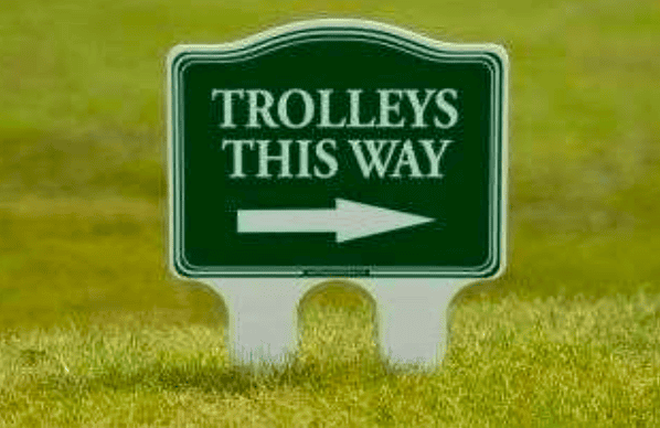 Running electric or hand trolleys over the tee boxes and between the greenside bunkers and the green is strictly prohibited.